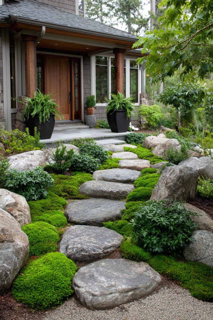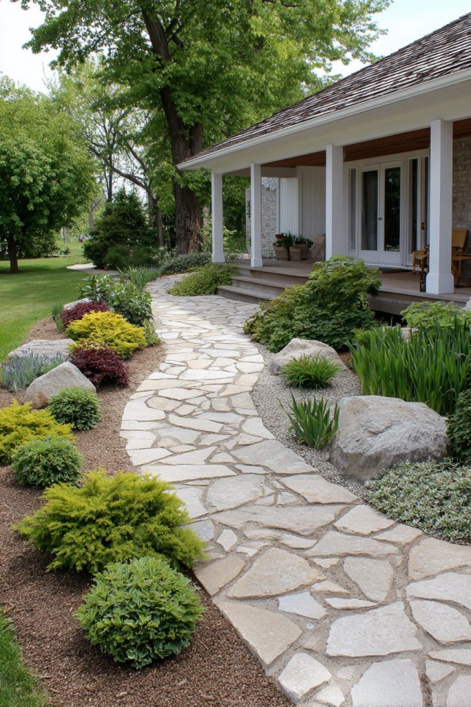 Using irregular stones adds texture and interest. Pair them with low plants or grass to keep the look fresh and inviting all year. This simple design works well for any style of home.