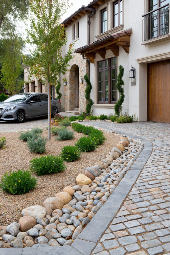 You can create a unique look by mixing different sizes of cobblestones along your driveway edge. This style adds charm and a natural feel to your front yard.
