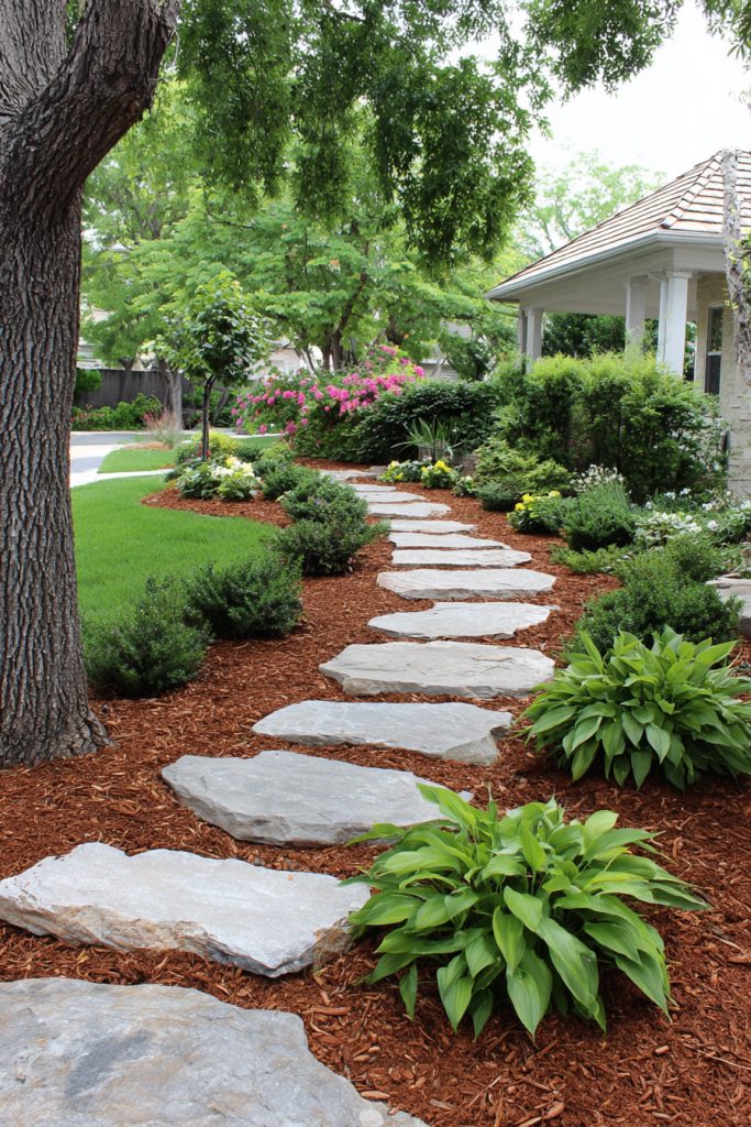 You can create a beautiful path in your front yard using flagstone set in mulch. The stones give your walkway a natural look, while the mulch helps keep weeds away and holds moisture for nearby plants. This mix also makes your yard easier to care for, giving it a neat and clean feel without much work.