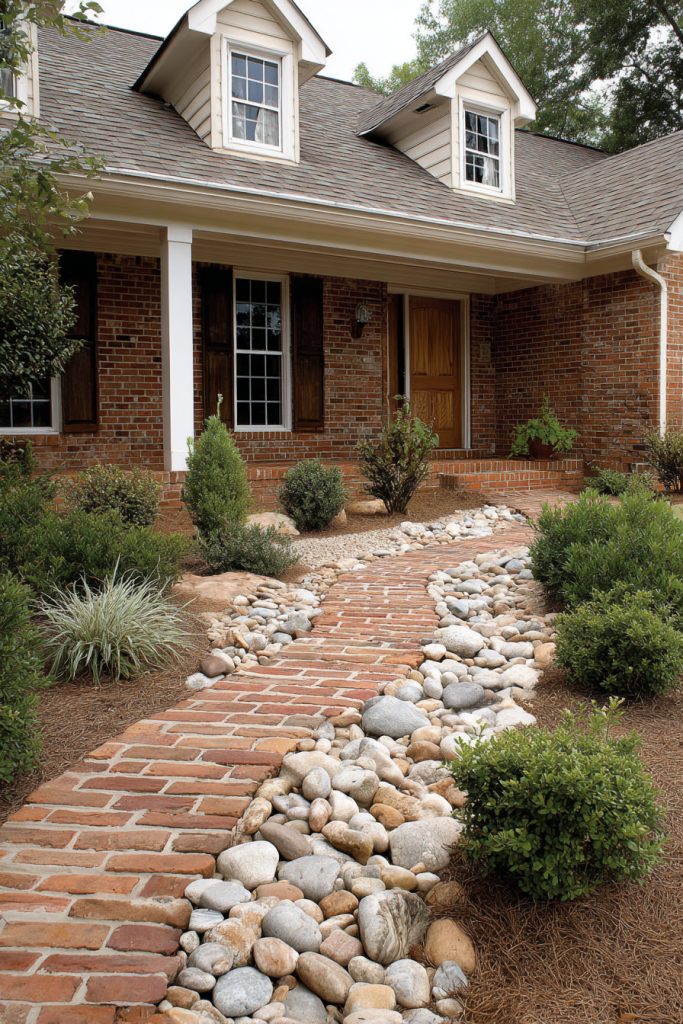You can create a beautiful pathway by mixing brick and stone. This combo adds texture and color to your front yard.