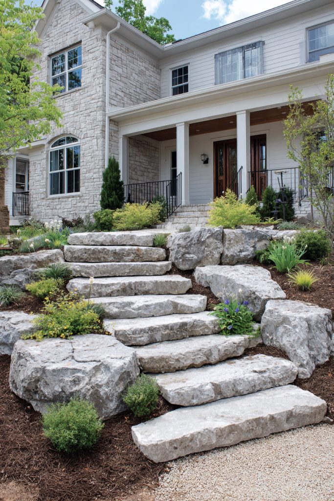 You can use natural stone steps to create a welcoming path to your front door. These steps are strong and blend well with outdoor spaces.