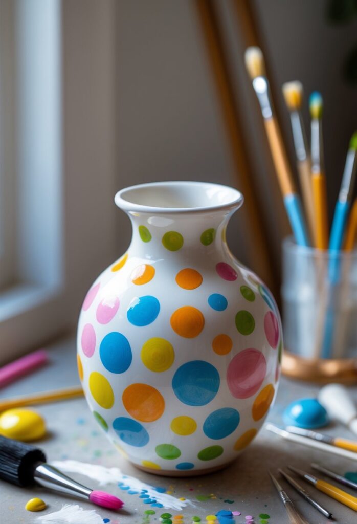 To get started, dip the tool in paint and gently press it onto your vase. Reload the tool for each dot to keep the size the same. This method works well even if you’re new to painting.
