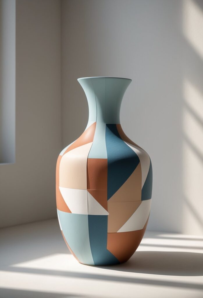 Next, paint each section with different colors for a bold look. When the paint dries, carefully peel off the tape to reveal crisp lines. This method makes your vase look modern and polished with little effort.