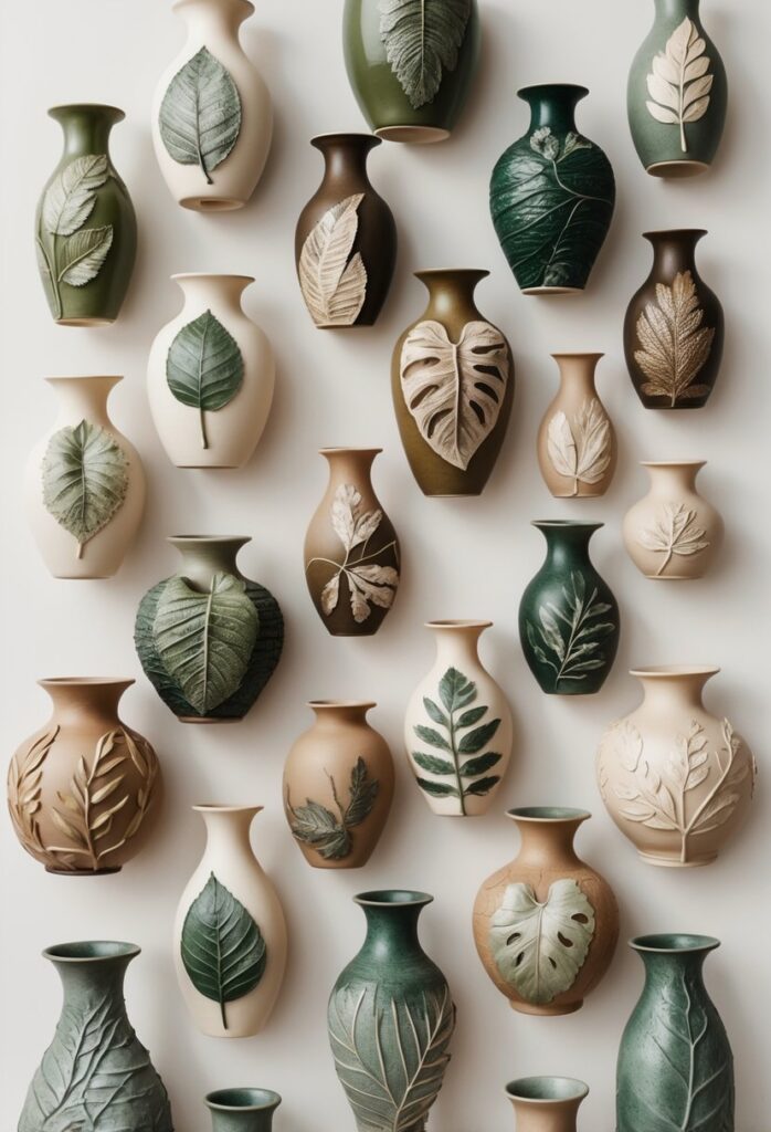 You can create beautiful vase designs using leaf imprints. Press real leaves onto your vase with paint to capture their shapes and veins. This method adds a natural and simple touch to your art.