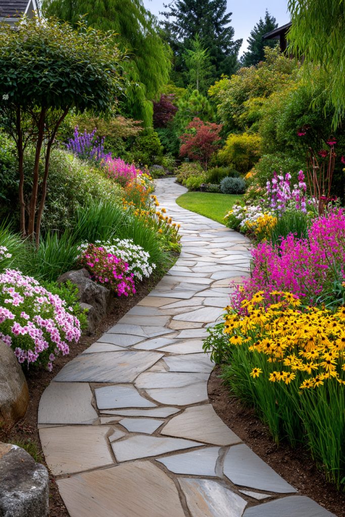 You can create a soft, natural feel with a curved flagstone path through your garden beds. The stones fit together in an organic way that blends with plants.