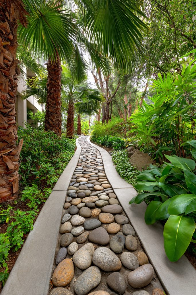 You can create a sturdy walkway by embedding natural river rocks in cement. This method keeps the stones in place while showing off their smooth, rounded shapes.