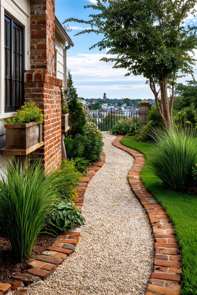 You can create a neat look by using bricks to frame a gravel path. The bricks keep the gravel in place and add structure to your walkway.