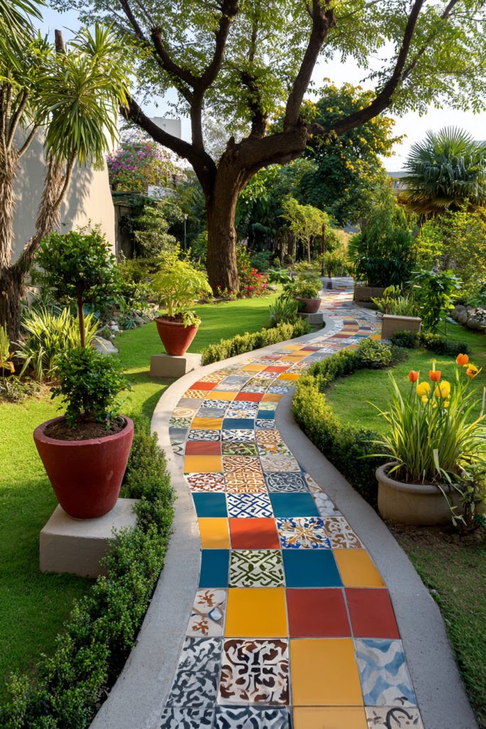 You can brighten your garden with a mosaic tile pathway. Using colorful patterns, you add charm and a personal touch to your outdoor space.