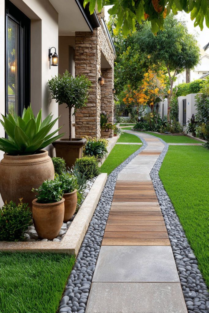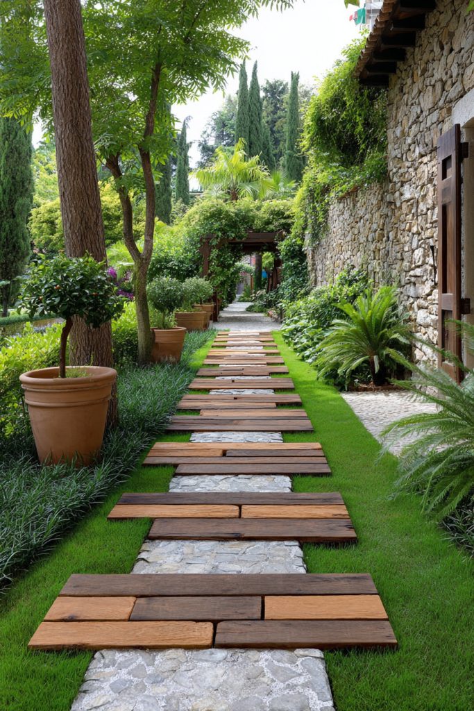 You can create a unique walkway by mixing wood and stone. The wood adds warmth, while the stone brings durability and texture. This blend works well in both rustic and modern yards.