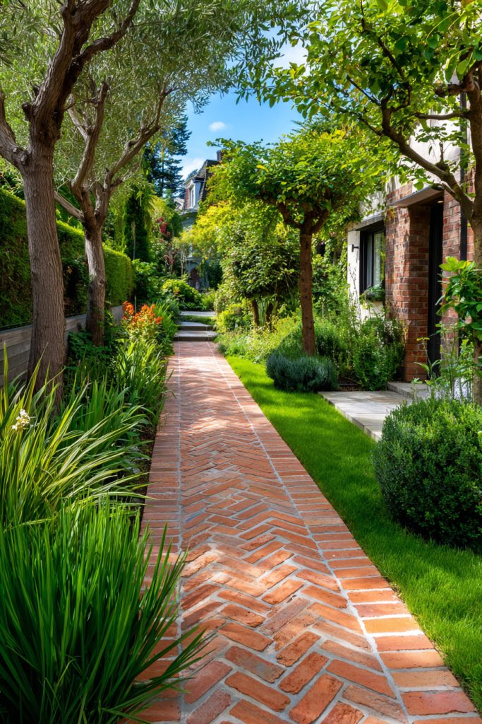 You can add charm to your yard with a red brick walkway in a herringbone pattern. This pattern creates a neat, zigzag look that feels both classic and inviting.