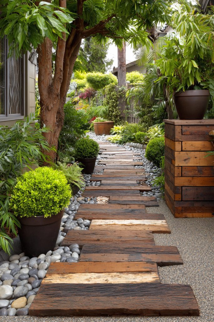 Using wood planks between stone slabs can make the path feel natural. It also breaks up the hard surface, making your path more interesting to walk on.