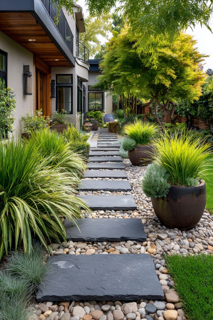 You can create a simple yet stylish walkway using large slate slabs. Space the slabs apart and fill the gaps with pea gravel.