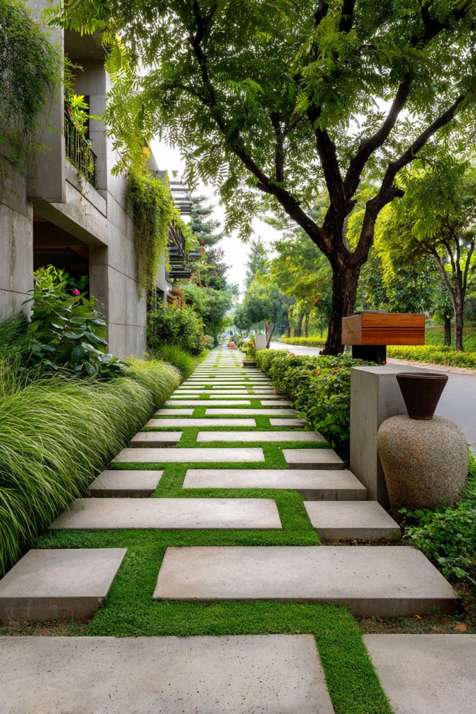 You can create a clean, modern look by using large rectangular concrete slabs spaced with grass in between. The grass softens the hard edges of concrete and adds a natural feel to your walkway.