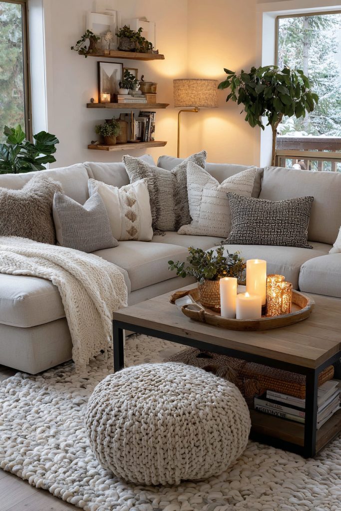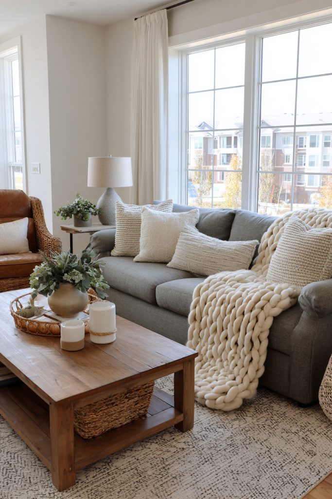 You can add warmth and style by layering chunky knit blankets over your sofa. Their thick texture invites you to curl up and relax after a long day.