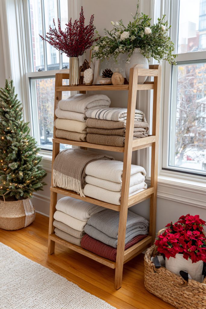 A ladder shelf can hold other decor like candles or small plants. It’s a simple way to bring warmth to your space this winter.