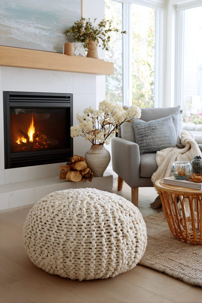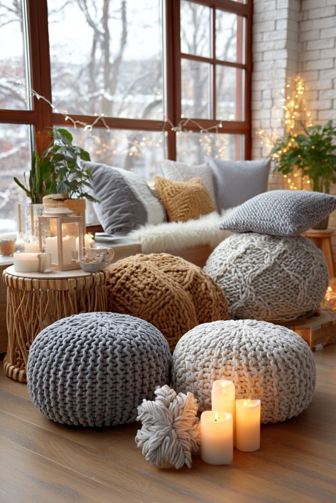You can make your space cozy by adding knit poufs. They give you extra places to sit that feel warm and soft.