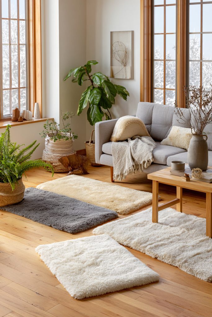 - 1. Layer plush area rugs in warm tones