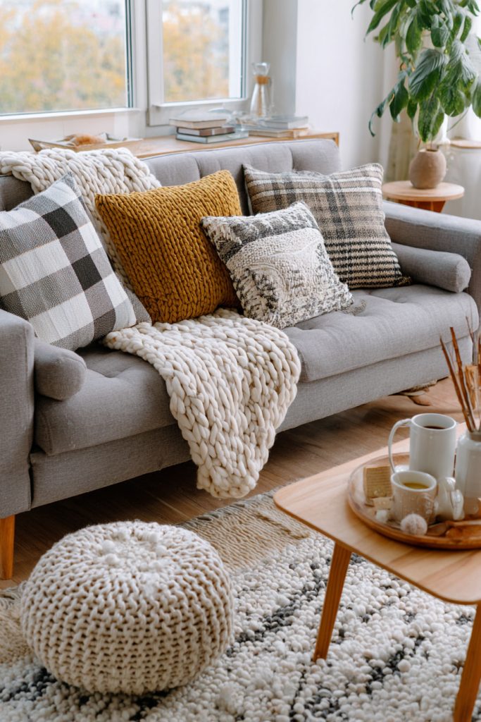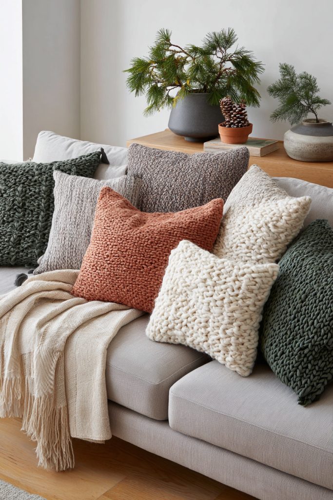 Knitted pillows also bring softness and texture. Mixing knits and plaids makes your room feel inviting and layered.