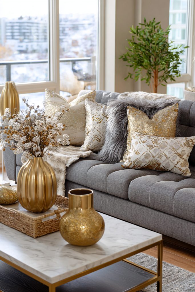 You can add warmth and light to your small living room with metallic accents. Gold or bronze pieces, like lamps or picture frames, catch the light and make the space feel cozy. These shiny touches bring a stylish and elegant look without crowding the room. Choose a few key items to highlight your winter decor easily.
