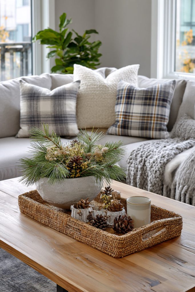 You can make your small living room feel cozy by adding a coffee table centerpiece with pine branches.