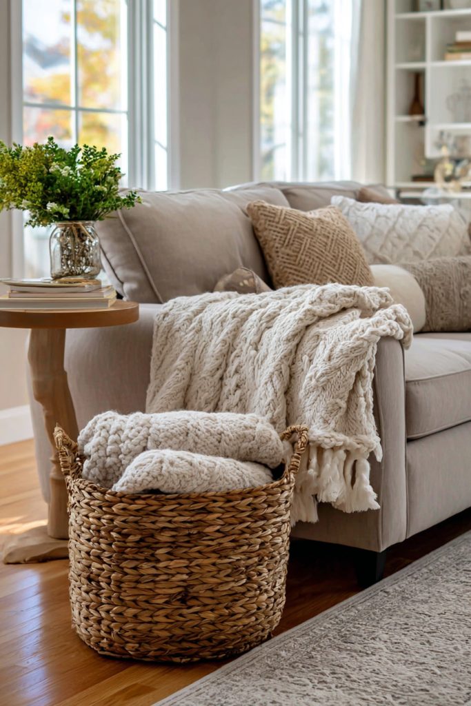 Place a large basket near your couch for easy access during chilly days. Choose neutral colors to match your room’s style and keep things simple.