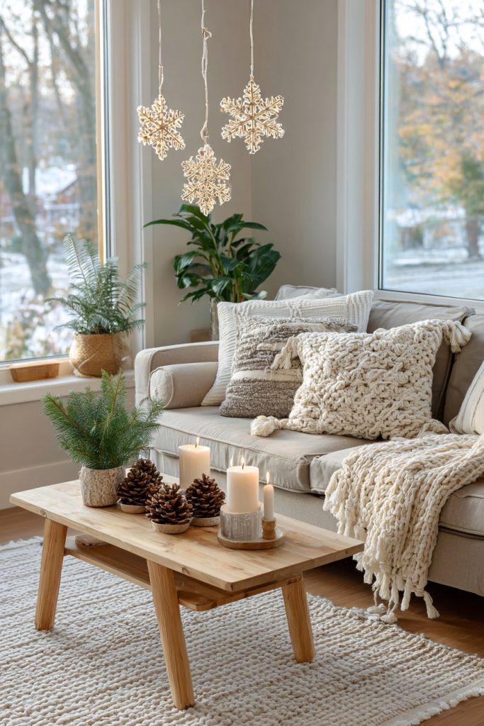 You can bring a cozy winter feel to your small living room by hanging delicate snowflake ornaments. They add a soft, wintry touch without cluttering your space.