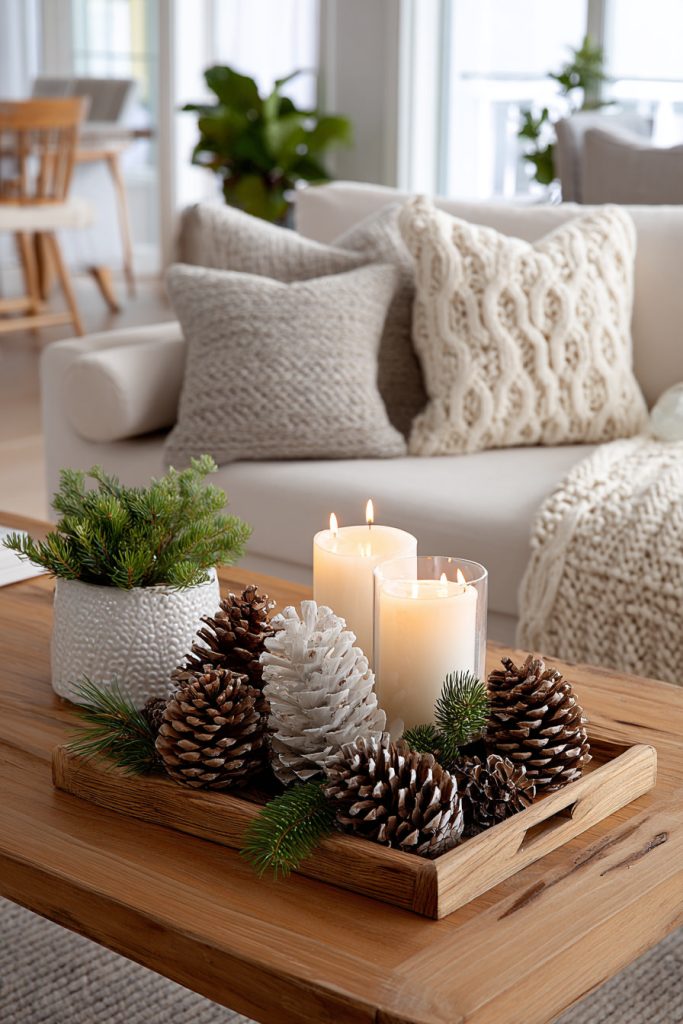 Pine branches bring a fresh, natural touch. Add small pinecones or candles to make it look stylish but simple.