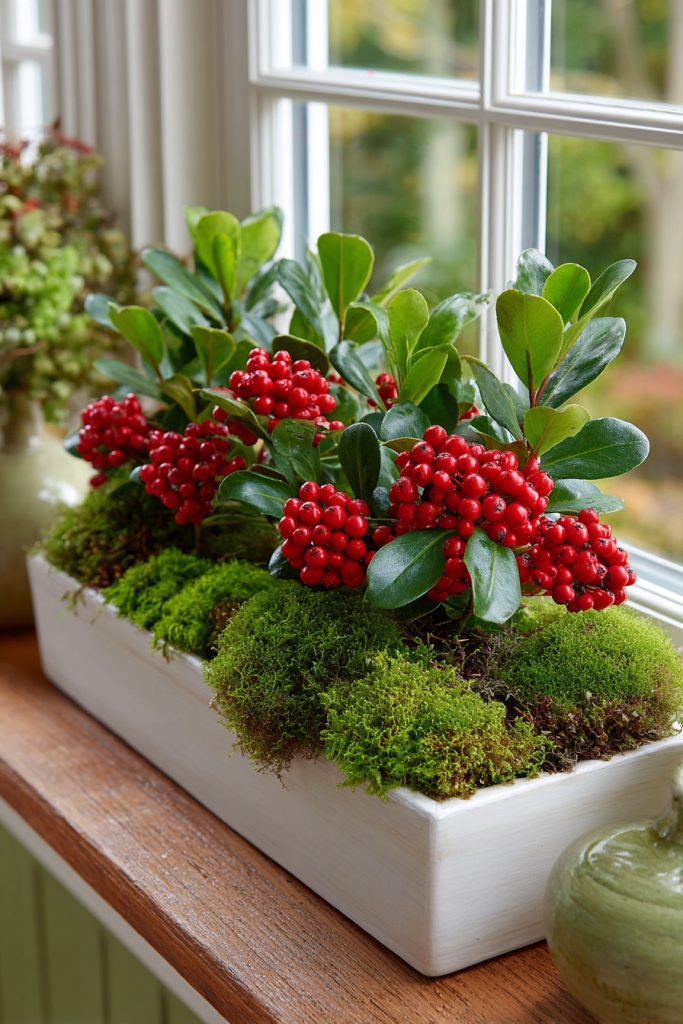 You can brighten your window box with bright red winterberry clusters. The berries add a pop of color that stands out in the winter months.