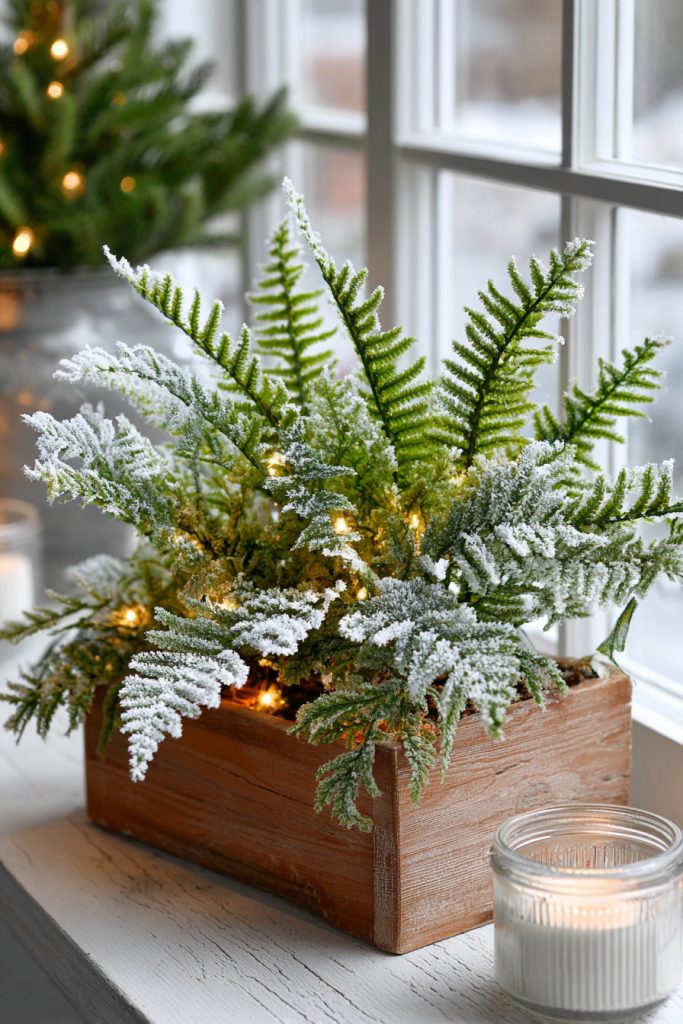 You can add frosted fern fronds to your winter window box for a soft, natural look. The frosted edges give the plants a light, icy feel that fits the season well.